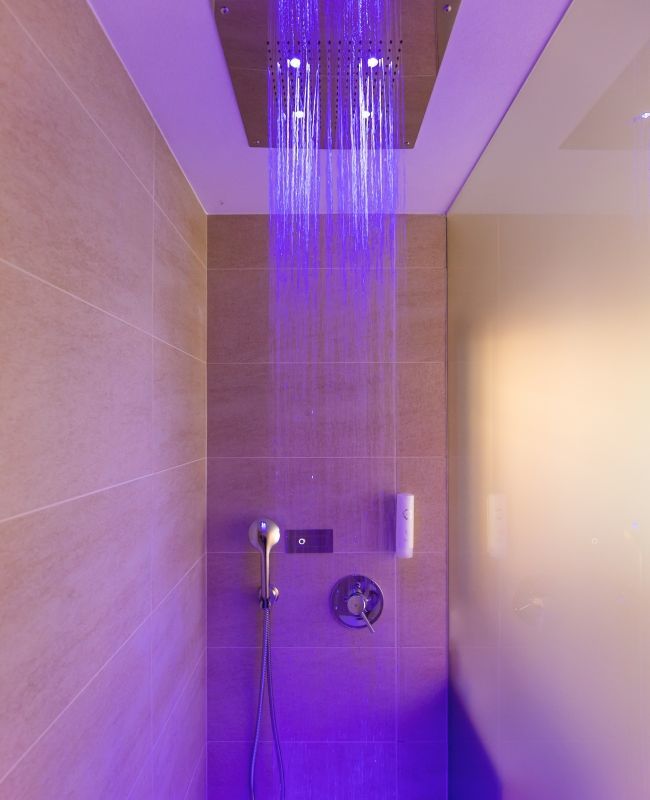 • The chromotherapy shower, equipped with a large overhead shower and lights in shades of blue, offers a unique experience, similar to a pleasant tropical rain, to regenerate body and mind.
